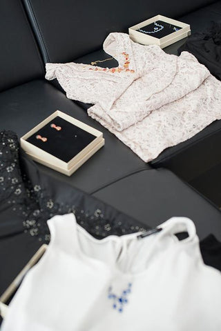 Po príchode do kaštieľa sa nachystalo všetko potrebné. Fotografka Zuzanka si nachystala interiér na fotenie, krásna Monika sa obliekla do svojej róby, vizážistka Heňka ešte svojim zázračným štecom doupravovala čo bolo treba a ako posledné prišli na rad šperky - ku každému outfitu jednotlivo. Fotenie sa mohlo začať a pokračovalo sa v humurnom duchu. Zuzka chcela zachytiť na fotkách aj Monikin smiech a jej krásny úsmev. Myslím, že nemala najmenší problém, nakoľko vizážistka a rozosmievačka v jednom sa o to postarala :).
