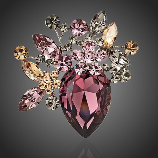 Luxusná nádherná brošňa s dominantným ružovofialovým krištáľom doplnená v záhone záhrady farebnými krištáľmi. Zachováva si dlhotrvajúci lesk a jas. Antialergické.
