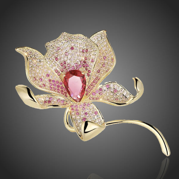Luxusná nádherná brošňa v tvare ladného kvetu vykladaná veľkým ružovým zirkónom a drobnými čírymi a ružovými zirkónmi v spoločnosti zažiari. Zachováva si dlhotrvajúci lesk a jas. Antialergické.