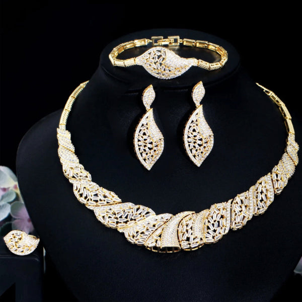 Exkluzívny set s krásnym motívom v zlatom prevedení obohatený stovkami čírych zirkónov s diamantovým odleskom v spoločnosti uchváti. Staňte sa skutočnou dámou. Jeho detaily Vás v skutočnosti nadchnú. Súčasťou setu je náhrdelník, náušnice, náramok a nadstaviteľný prsteň. Vďaka kvalitnej galvanizácii 3 vrstvou žltého zlata si zachováva dlhotrvajúci lesk a jas. Bez obsahu niklu, olova, kadmia. Antialergické.