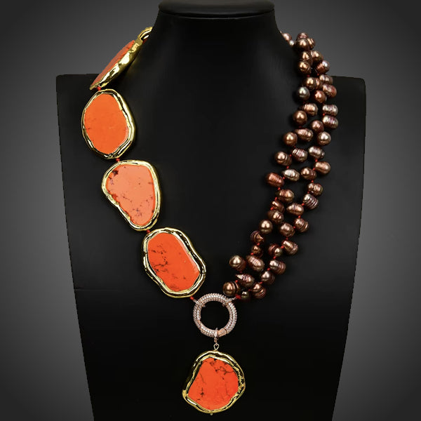 Exkluzívny neprehliadnuteľný náhrdelník s riečnymi coffee rice perlami doplnený oranžovými kameňmi v zlatých aplikáciach s efektným visiacim príveskom. Aplikácie sú galvanizované 3 vrstvou žltého zlata. Každý kus je ručne vyrobený originál. Pre jedinečnú dámu. Antialergické.