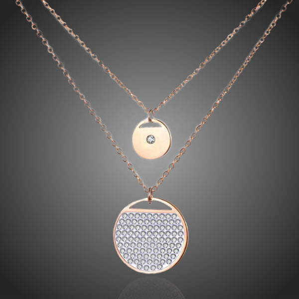 Elegantný náhrdelník s dvojretiazkou s kruhovými príveskami v kombinácii so žiarivými čírymi krištáľmi. Zachováva si dlhotrvajúci lesk a jas. Antialergické.