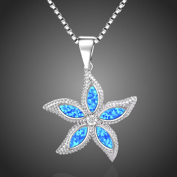 Nádherný náhrdelník s fire opálom s očarujúcou žiarou modrej v kvete s drobnými čírymi zirkónmi. Vďaka galvanizácii si zachováva dlhotrvajúci lesk a jas. Antialergické.