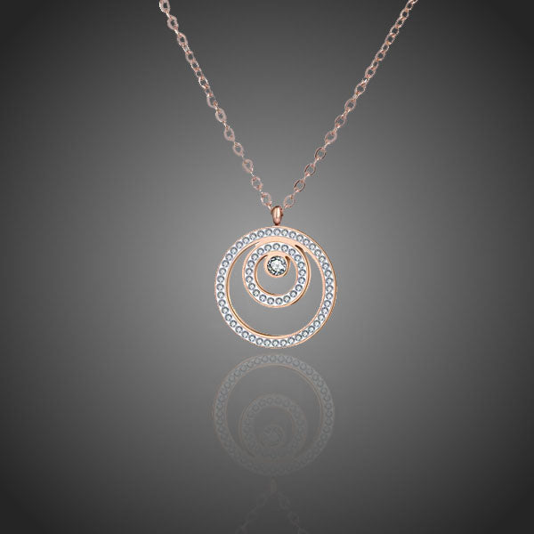 Elegantný náhrdelník s trojkruhmi vykladaný čírymi krištáľmi. Zachováva si dlhotrvajúci lesk a jas. Antialergické.