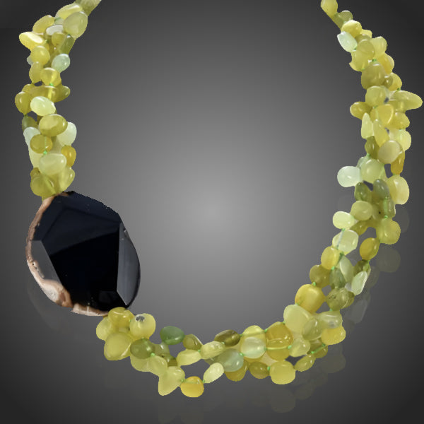 Exkluzívny náhrdelník so zelenkavo-olivovým prírodným jadeitom doplnený achátom v dekolte vynikne. Kvalita kameňov sa určuje sfarbením a tvarom. Každý kus je ručne vyrobený originál. Pre jedinečnú dámu.