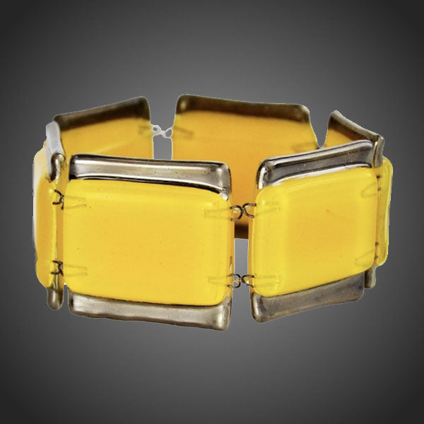Nádherný originálny náramok v prevedení ručne malovaného žtého odolného skla zdobeného pravou platinou. Všetky kovové komponenty v šperku sú z leštenej chirurgickej ocele 316L, antialergické.