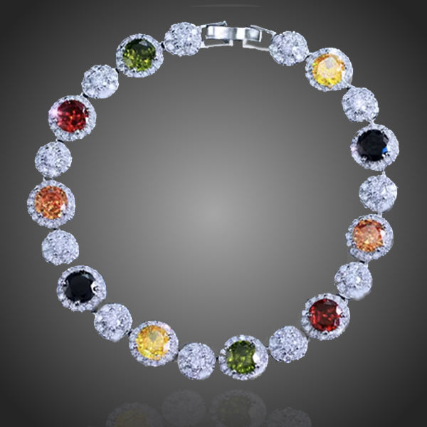 Žiarivý dámsky farebný náramok vykladaný čírymi, oranžovými, zelenými, červenými a modro-čiernymi zirkónmi osvieži nejeden outfit. Súčasťou je aj 3 cm predĺženie na treťom obrázku, ktoré môžete použiť. Vďaka kvalitnej galavnizácii 3 vrstvou bieleho zlata si zachováva si dlhotrvajúci lesk a jas. Bez obsahu niklu, olova, kadmia. Antialergické.