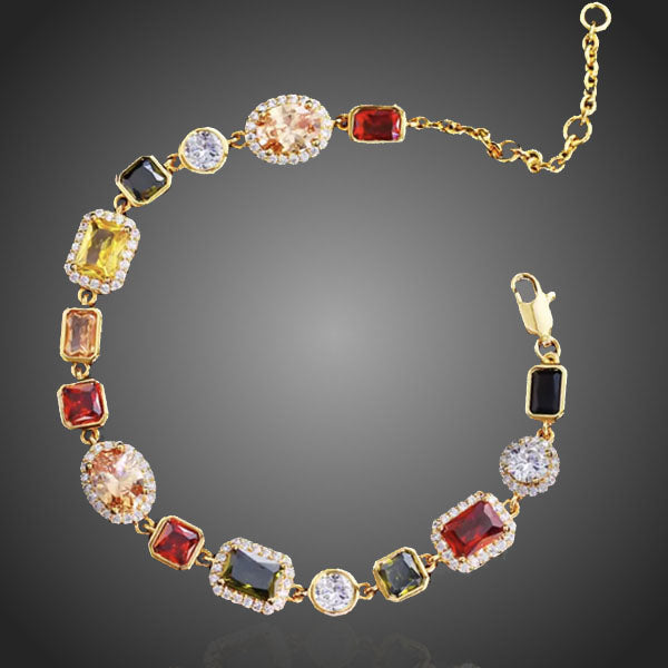Elegantný dámsky náramok vyniká precíznym spracovaním a harmonickým dizajnom farebných zirkónov. Spája v sebe spája jemnosť, ženskosť a nádych luxusu. Vďaka kvalitnej galavnizácii 3 vrstvou žltého zlata si zachováva si dlhotrvajúci lesk a jas. Bez obsahu niklu, olova, kadmia. Antialergické.