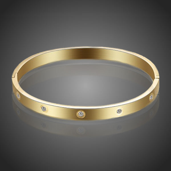 Elegantný pevný dámsky náramok z chirurgickej ocele vo farbe žltého zlata doplnený čírymi krištáľmi. Zachováva si dlhotrvajúci lesk a jas. Antialergické.