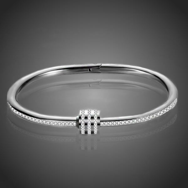 Elegantný dámsky náramok z chirurgickej ocele vo farbe bieleho zlata s drobnými čírymi krištáľmi pozdĺž náramku s dôrazom na krištáľovú aplikáciu v strede. Zachováva si dlhotrvajúci lesk a jas. Antialergické.