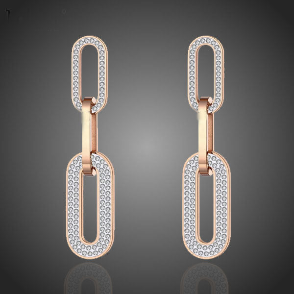 Zaujímavé visiace náušnice v geometrickom tvare vykladané čírymi krištáľmi. Zachováva si dlhotrvajúci lesk a jas. Antialergické.