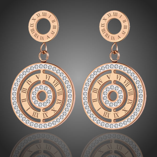 Krásne kruhové visiace náušnice s akcentom ciferníka vyzdvihnuté žiarivými krištáľmi. Zachováva si dlhotrvajúci lesk a jas. Bez obsahu niklu. Antialergické.