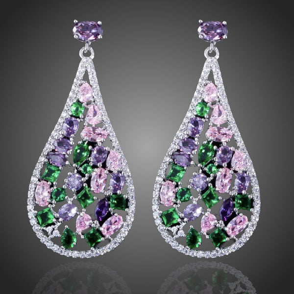 Visiace dámske náušnice v žiari ružových, fialových, zelených a čírych zirkónov v ladných kvapkách sa stanú krásnym doplnkom. Zachováva si dlhotrvajúci lesk a jas. Bez obsahu niklu, olova, kadmia. Antialergické.