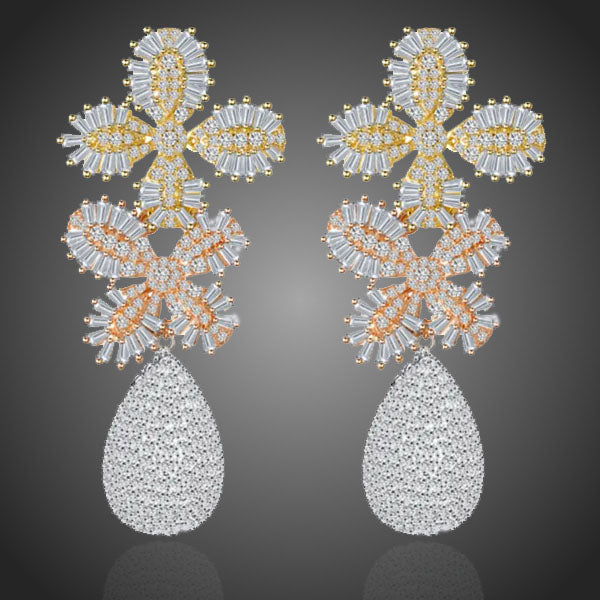 Nádherné luxusné visiace náušnice s akcentom kvetov v žiari stoviek čírych zirkónov s ladnými kvapkami vyzdvihnú Váš celkový outfit. Vhodné ako spoločenské, či svadobné náušnice. Vďaka galvanizácii 3 vrstvou žltého zlata si zachovávavjú dlhotrvajúci lesk a jas. Bez obsahu niklu, olova, kadmia. Antialergické.