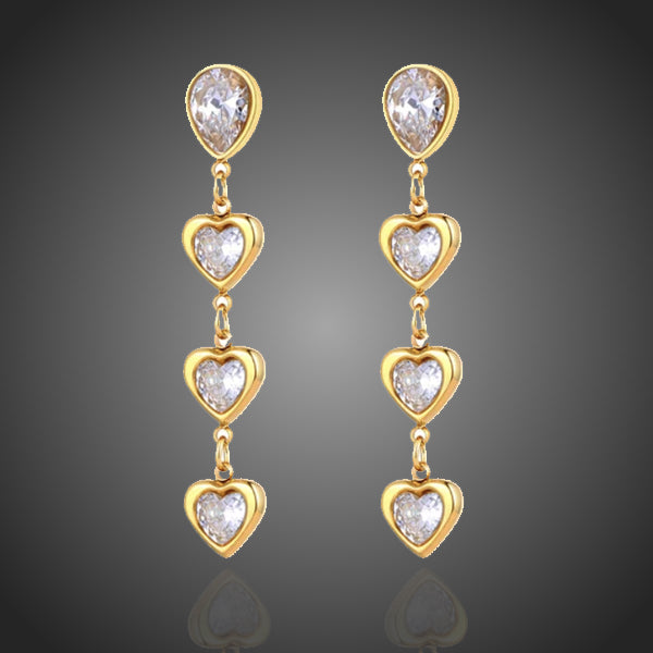 Ladné dlhé visiace náušnice so srdiečkami vykladané čírymi zirkónmi na ušku zažiaria. Zachováva si dlhotrvajúci lesk a jas. Antialergické.