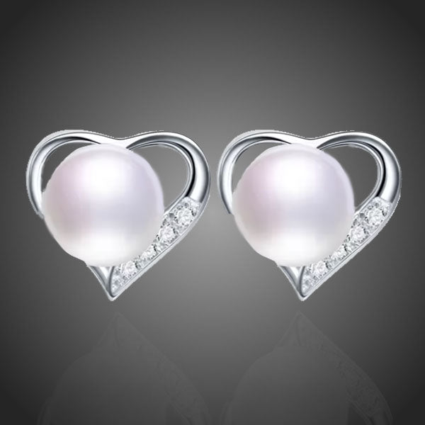 Srdiečkové náušnice s bielymi riečnymi perlami doplnené čírymi zirkónmi. Vďaka galvanizácii platinou si zachováva dlhotrvajúci lesk a jas. Bez obsahu niklu, olova, kadmia. Antialergické.