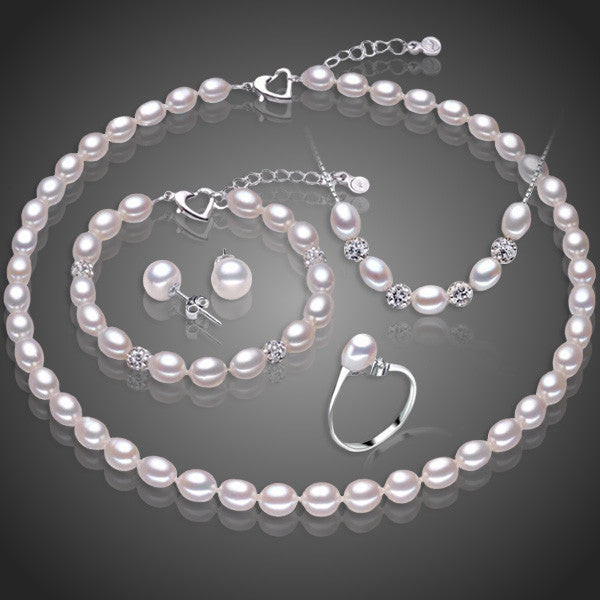 Nádherný perlový set s bielymi riečnymi perlami typu rice. Sada obsahuje perlový náhrdelník, retiazku s perlami a zirkónovymi guľôčkami, náramok, náušnice a prsteň. Vďaka galvanizácii platinou si zachováva dlhotrvajúci lesk a jas. Antialergické.