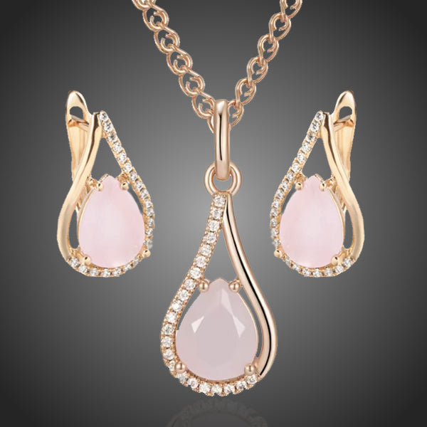 Romantický dámsky set so štíhlou líniou kvapky a náušníc s jemne ružovým modným opálom a čírymi zirkónmi. Doplnok pre jedinečné chvíle. Vďaka galvanizácii si zachováva dlhotrvajúci lesk a jas. Bez obsahu niklu, olova, kadmia. Antialergické.