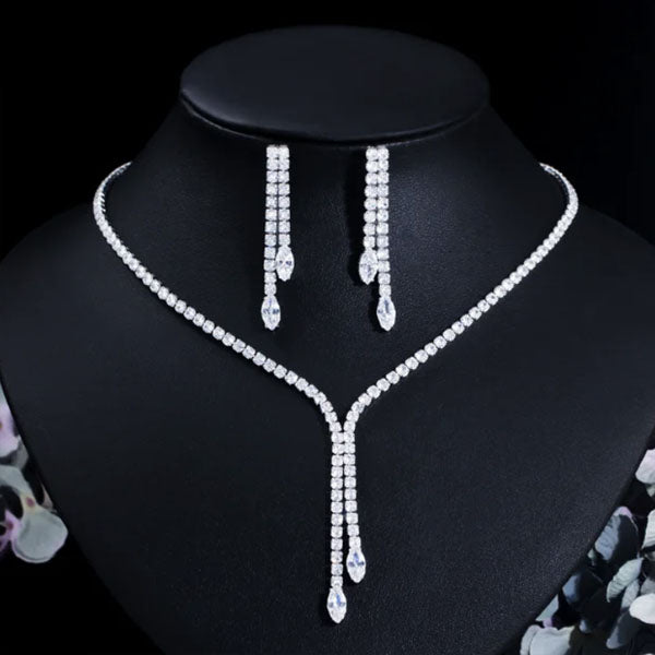 Elegantný jemný s mnohými čírymi zirkónmi v jemnom vodopáde na dáme zažiari. Krásny spoločenský alebo svadobný set. Vďaka kvalitnej galvanizácii 3 vrstvou bieleho zlata si zachováva dlhotrvajúci lesk a jas. Bez obsahu niklu, olova, kadmia. Antialergické.